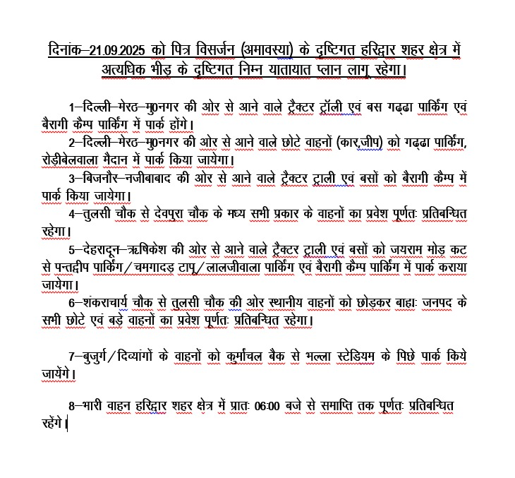पित्र विसर्जन अमावस्या पर श्रद्धालुओं की भारी भीड़ को देखते हुए ट्रैफिक पुलिस ने 21 सितंबर को विशेष यातायात प्लान लागू कर दिया है। शहर में कई रास्तों पर वाहनों की एंट्री पूरी तरह प्रतिबंधित रहेगी, वहीं बाहर से आने वाले वाहनों के लिए तय पार्किंग स्थल बनाए गए हैं।