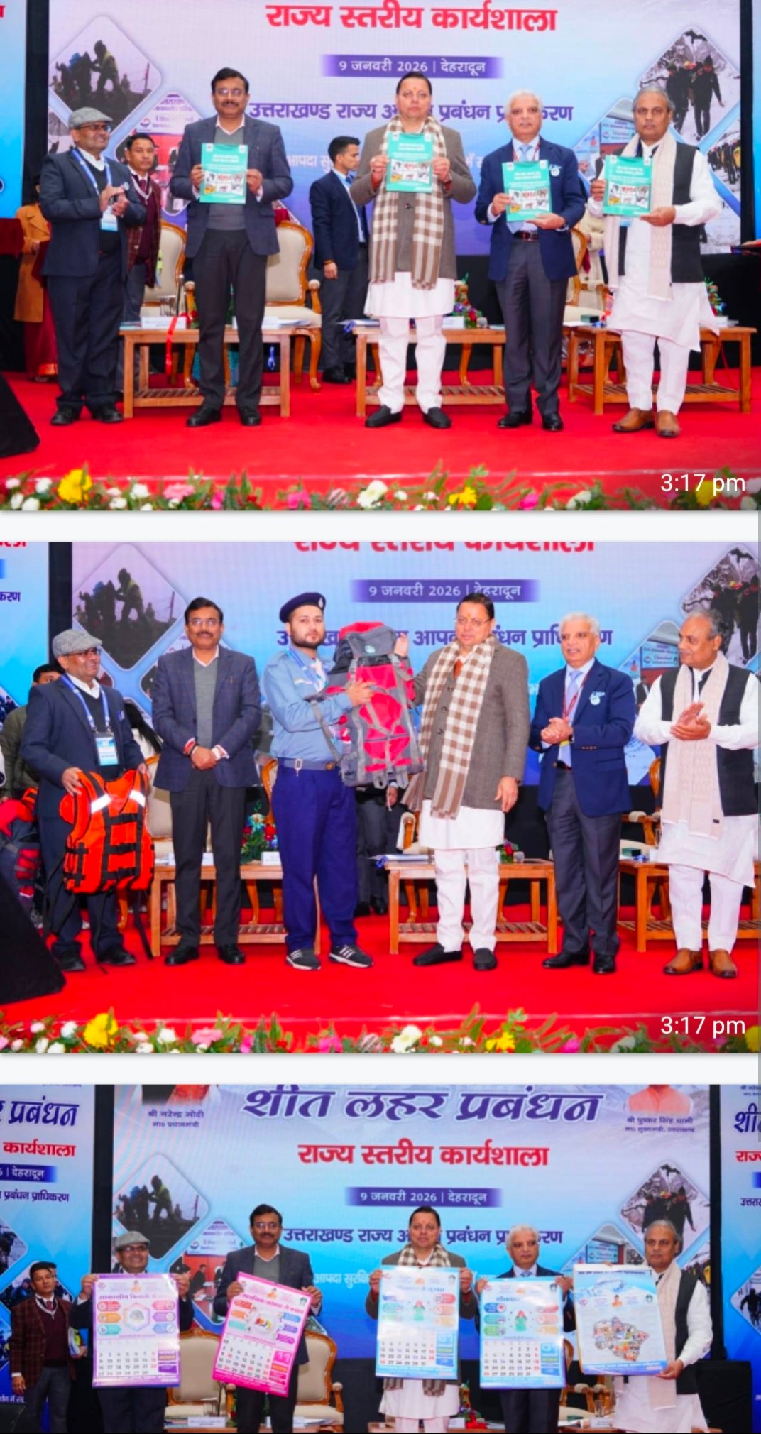 मुख्यमंत्री श्री पुष्कर सिंह धामी ने शुक्रवार को सर्वे ऑफ इंडिया ऑडिटोरियम, हाथीबड़कला में ‘शीतलहर पूर्व तैयारी’ विषय पर आयोजित एक दिवसीय कार्यशाला का शुभारंभ किया। इस अवसर पर उन्होंने शीतलहर, बाढ़, मॉक अभ्यास, हवाई यातायात सहायता की एस.ओ.पी., आपदा प्रबंधन विभाग के नववर्ष कैलेंडर 2026 एवं आपदा प्रबंधन हस्तपुस्तिका का विमोचन किया। कार्यक्रम के दौरान मुख्यमंत्री ने युवा आपदा मित्रों एवं वर्ष 2025 में आपदा के दौरान राहत एवं बचाव में सराहनीय कार्य करने वाले लोगों को सम्मानित भी किया। आपदा प्रबंधन के लिए स्टेट बैंक ऑफ इंडिया द्वारा उपलब्ध कराए गए चार वाहनों का भी मुख्यमंत्री ने फ्लैग ऑफ किया।