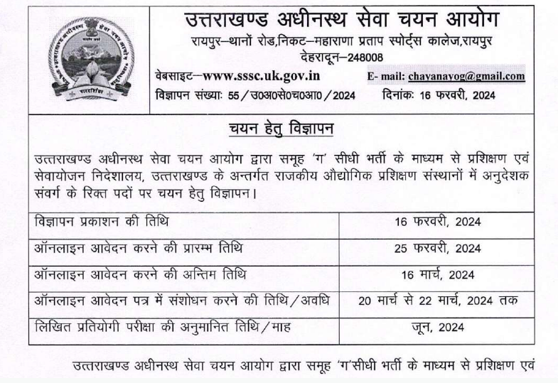 देहरादून। उत्तराखंड अधीनस्थ सेवा चयन आयोग ने समुह ग सीधी भर्ती के माध्यम से प्रशिक्षण एवं सेवायोजन निदेशालय के अन्तर्गत राजकीय औद्योगिक प्रशिक्षण संस्थानों में अनुदेशक संवर्ग के कुल 370 रिक्त पदों पर चयन हुेतु ऑनालाइन आवेदन पत्र आमनित्रत किए गये है। अभ्यर्थी आयोग की www.sssc.uk.gov.in वेबसाइट पर दिनांक 16 मार्च 2024 तक ऑनलाइन आवेदन कर सकते है।