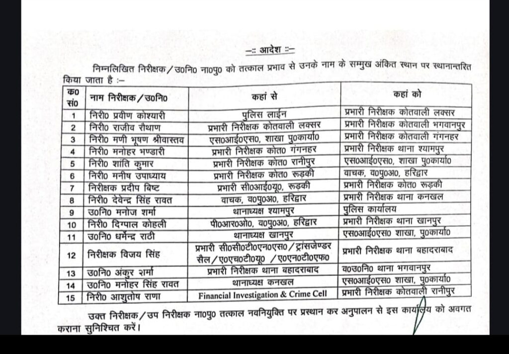 एसएसपी हरिद्वार प्रमेन्द्र डोभाल ने देर रात 11 इंस्पेक्टरों सहित चार दरोगाओं के कार्यक्षेत्र में परिवर्तन किया है। निरीक्षक देवेंद्र सिंह रावत को कनखल की , निरीक्षक विजय सिंह को बहादराबाद की एवं निरीक्षक आशुतोष राणा को रानीपुर हरिद्वार की मिली जिम्मेदारी बाकी देख ले लिस्ट-