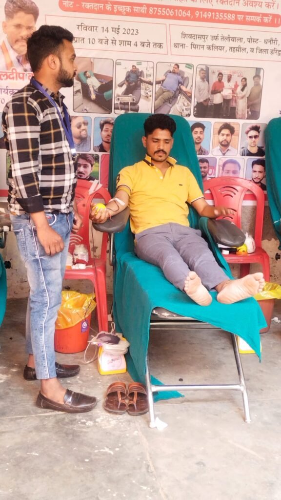 कल दिनांक 14 मई 2023 को ग्राम शिवदासपुर उर्फ़ तेलीवाला में एक दिवसीय ऑल इंडिया ब्लड डोनर टीम के द्वारा स्वछिक रक्तदान शिविर का आयोजन किया गया जिसका शुभारम्भ कार्यक्रम संयोजक कुलदीप कुमार सैनी,रक्तवीर निखिलपाल,मदरट्रेसा ब्लडबैंक प्रबंधक डॉ नीलिमा सैनी जी ने भारत माता जी के चित्र पर पुष्प अर्पित कर दीप प्रज्वलित कर किया गया। रक्तदान शिविर में ग्रामीण क्षेत्र के युवाओं ने बढ़ चढ़कर भाग लिया और 55 यूनिट का योगदान किया।